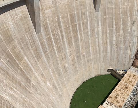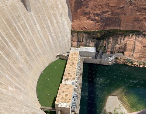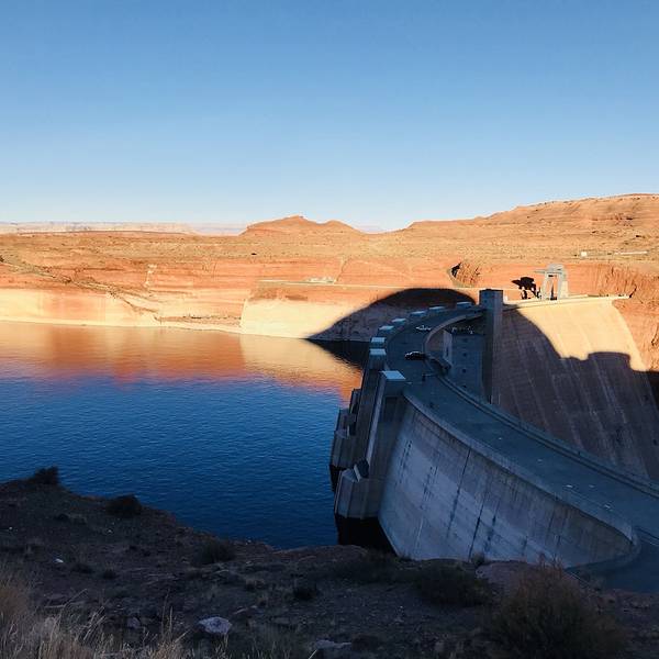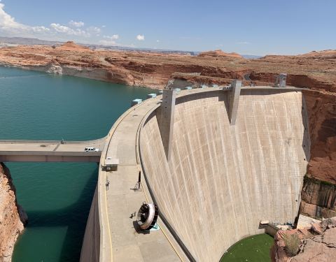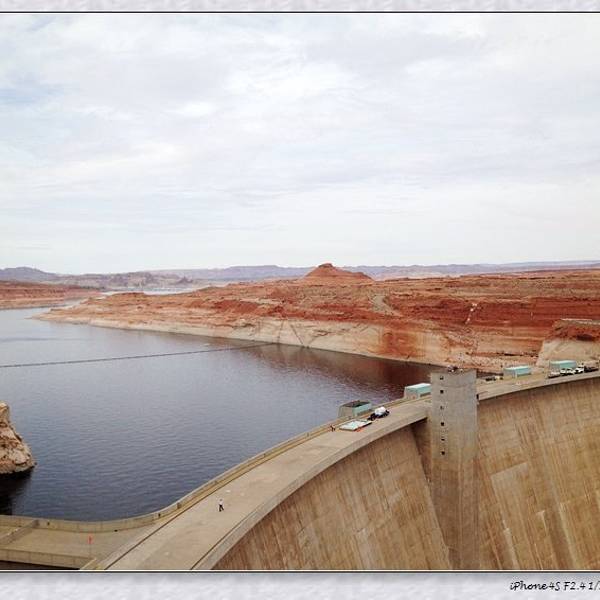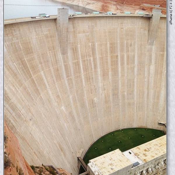 格兰大坝在鲍威尔湖,一座大坝拦住了科罗拉多河,形成了鲍威尔湖,大坝落差超过胡佛,非常壮观亚利桑那州。格兰大坝在鲍威尔湖,一座大坝拦住了科罗拉多河,形成了鲍威尔湖,大坝落差超过胡佛,非常壮观。 大坝上面有停车场和旅客中心,旅客中心有免费卫生间和纪念品店。