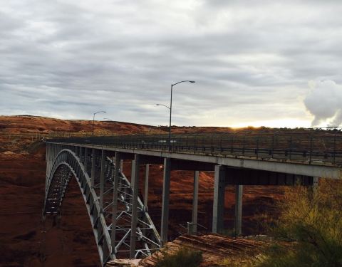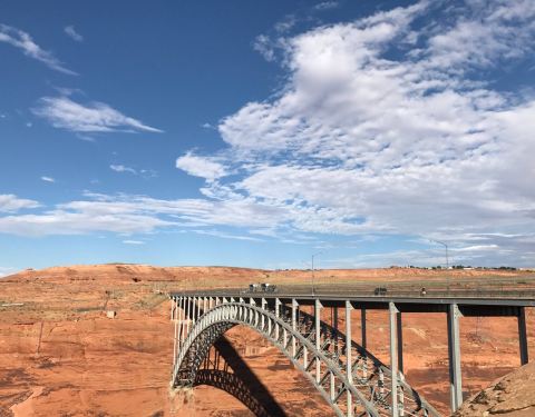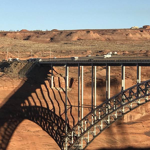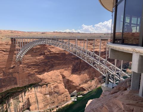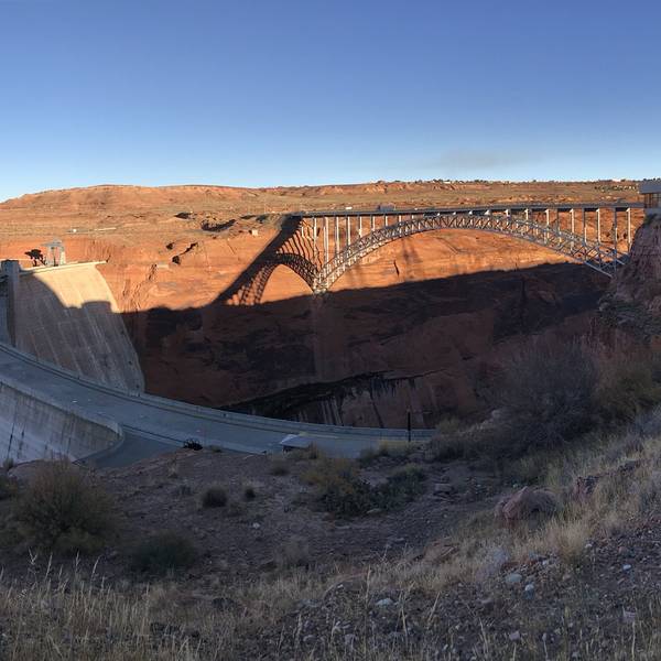 格伦峡谷大桥和格伦峡谷大坝在鲍威尔湖的尽头,图片是在格伦大坝游客中心位置拍的格伦峡谷大桥和格伦峡谷大坝在鲍威尔湖的尽头,图片是在格伦大坝游客中心位置拍的。格伦峡谷大坝修建于1956年,格伦峡谷大桥的钢骨架桥梁优雅的跨过峡谷,高于河面213米,桥拱跨度313米,桥面长387米,宽9米。我...格伦峡谷大桥和格伦峡谷大坝在鲍威尔湖的尽头,图片是在格伦大坝游客中心位置拍的。格伦峡谷大坝修建于1956年,格伦峡谷大桥的钢骨架桥梁优雅的跨过峡谷,高于河面213米,桥拱跨度313米,桥面长387米,宽9米。我们是准备离开佩吉的早晨来这里看了一眼。 展开