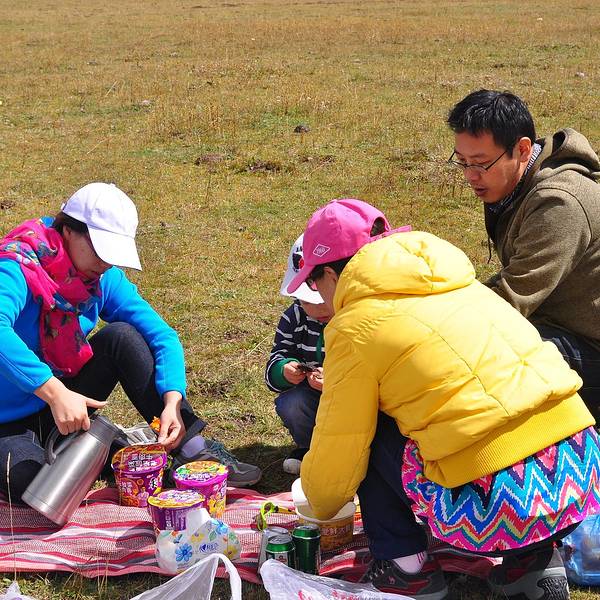 从查针梁子下来,一马平川的红原龙日坝大草原迎面而来。龙日坝大草原以前曾为部队的军马埸,过去盛产良马,现在则遍地牛羊。公路两侧的大草原上散布着许多“牧家乐”营帐,游人可在此骑马、如想深度体验牧民生活,也可在帐篷中过夜。此时已是中午时分,刚翻越高原的我们决定在此暂作歇息,就在这一望无际的草原上,头顶蓝天白云,沐浴着高原炙热的阳光,来个草原路餐。