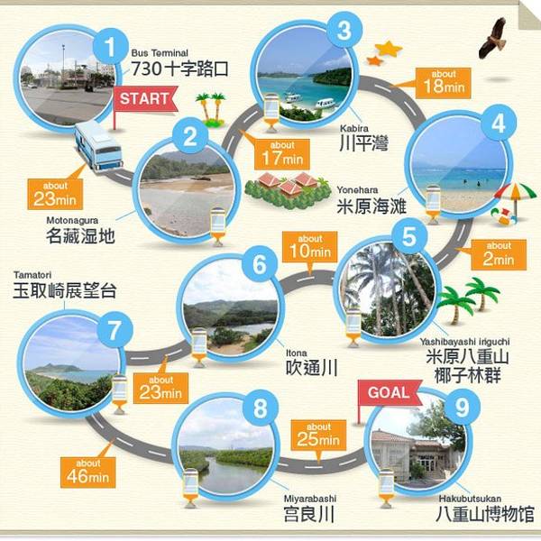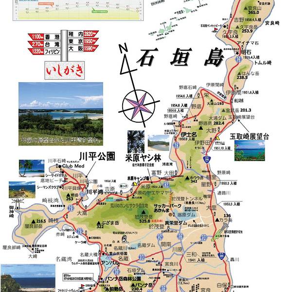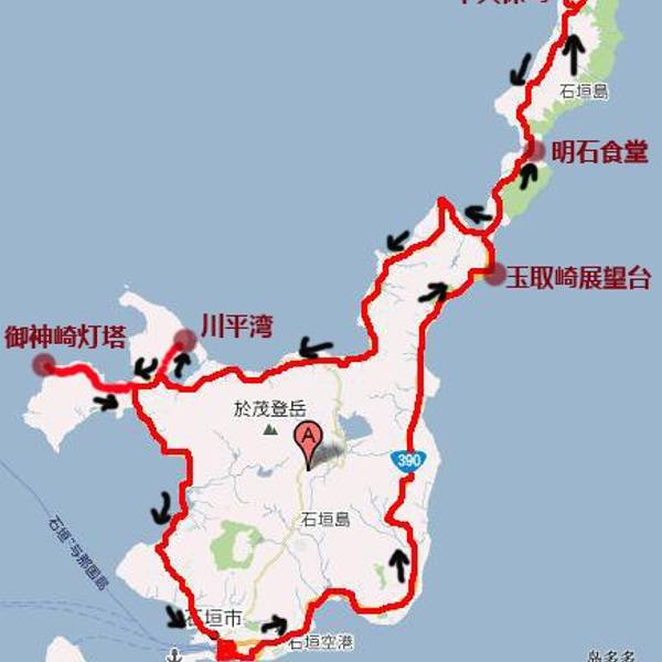 石垣岛东巴士官网http://www.cosmos.ne.jp/~bus/公交线路基本就是围着岛一圈,但是漂亮的御神崎和平久保崎不自驾基本是去不了的……自驾线路可以如下……东巴士有个定期观光路线,都是4个半小时,4600円,可以选择上午还是下午。