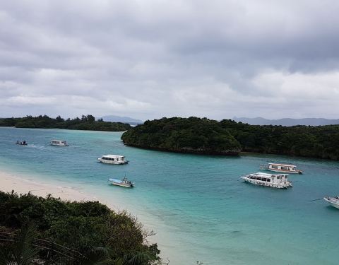 川平湾是当地十分有名的景点。其沙滩白皙细腻,海水色彩梦幻,好似马尔代夫。海面下有上百种千奇百怪的珊瑚。在珊瑚周围,生活着大大小小、各式各样的热带鱼,可以坐玻璃船出海看珊瑚和鱼。玻璃船的底部是整块的透明玻璃,是带游客看水下珊瑚和热带鱼的小船。一次出海约30分钟的时间,每个人1030日元,合60多元人民币。