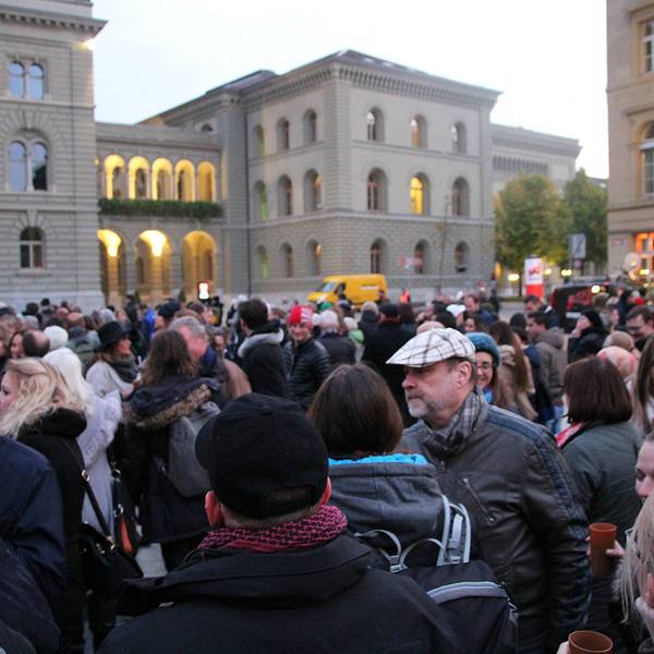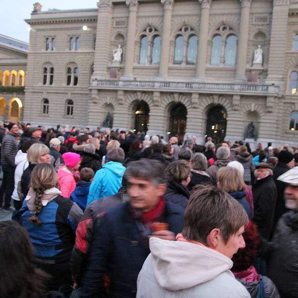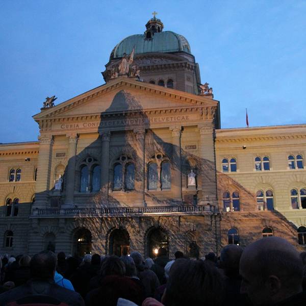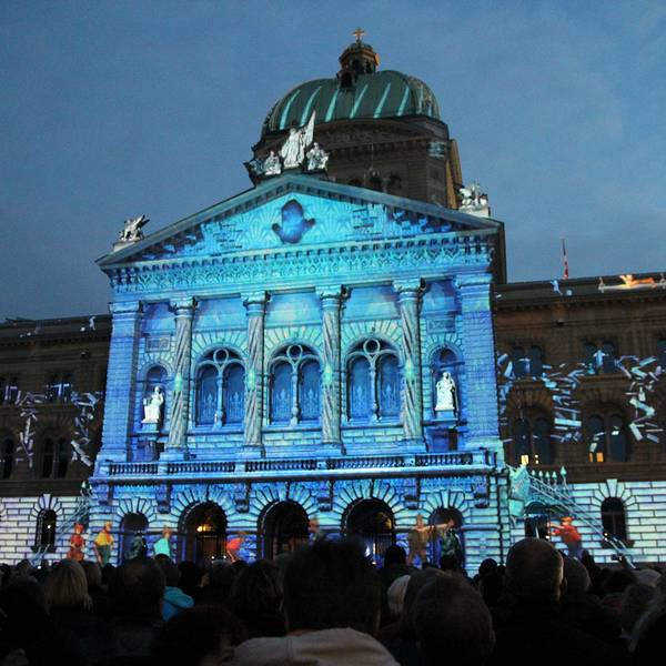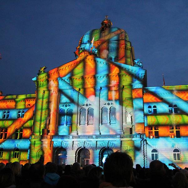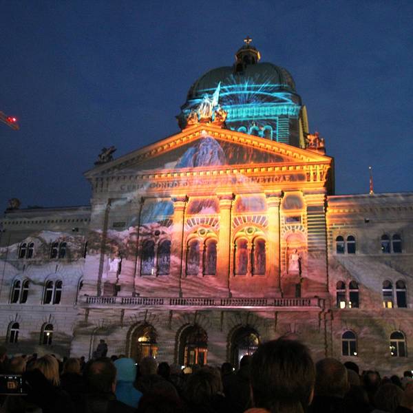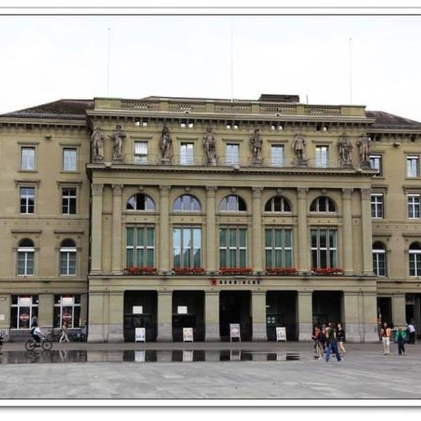 这里装饰华丽,立有瑞士国父们的雕像,一盏由214个灯泡组成的大吊灯映衬着彩色玻璃穹顶。大楼前的广场还有喷泉表演。