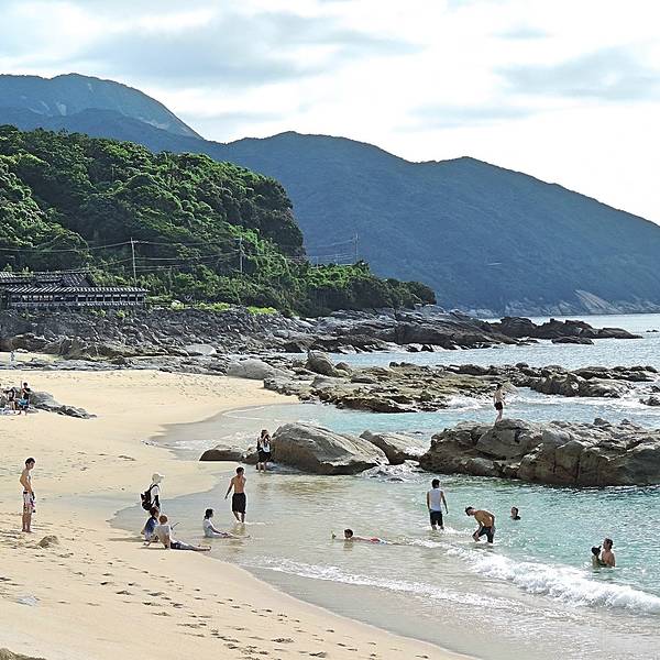 但永田还有屋久岛最好的沙滩。事实上,屋久岛被称为海上阿尔卑斯,地势险峻。这里的陆地很少平缓地向海中延伸,因此连海滩都不多,更不用说沙滩。我这一圈看下来,除了永田大概还有一两个沙滩,但最好的无疑就是永田。这也是我在环岛巡游中看到的人最多的地方,整片沙滩怎么着都得有三四十人吧,貌似还有个十几人的旅游团。