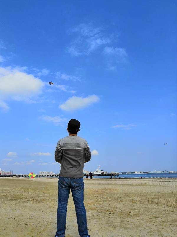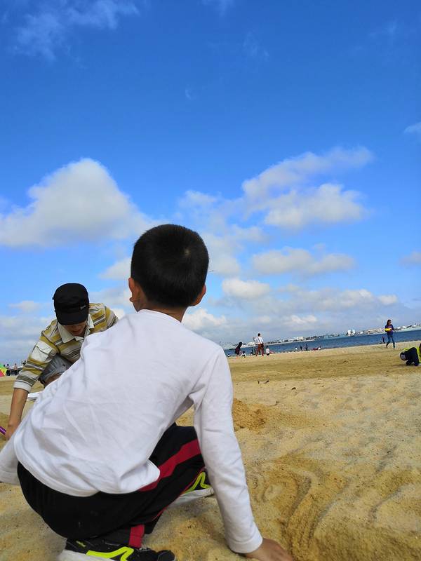 我们...带上两个娃,收拾好出门,也是十点左右了。这才叫蓝蓝的天上白云飘。霸气不?疯狂的人,还真是跳起来了。大海的颜色,真的是多变的。给小朋友们买了铲子和桶,小朋友们玩得更嗨了,到吃饭时间,都不愿意走。