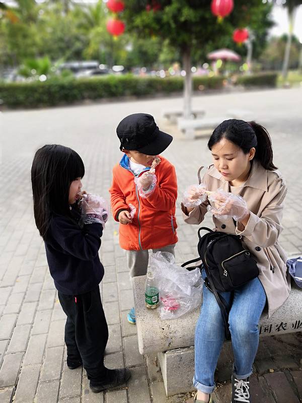 饭后,又打车回来了渔港公园。后来,才知道,今天一整天都要耗在这里。旁边有躺椅,我们就坐下了。我要踢走这片云。中途想了好多次,再去找个地方玩一下。但是看到孩子们玩得这么高兴,根本开不了口。让他们一直玩,他们说挖了一个大工程,把海里面的水,灌进来了。两个又叫又跳,兴奋得不行。哈哈哈。吃鸡三人组最后,说回去了,把打包的湛江鸡拿出来,分着吃了。