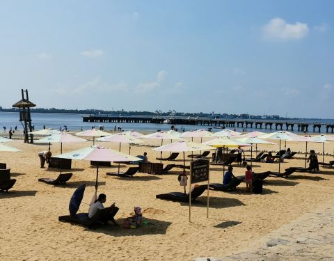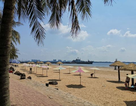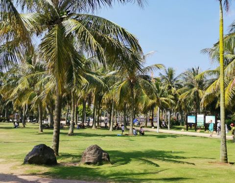 从海滨宾馆海洋路小门出来就是渔港公园,渔港公园有海滨浴场,可以游泳,也有快艇可坐,要花钱的从海滨宾馆海洋路小门出来就是渔港公园,渔港公园有海滨浴场,可以游泳,也有快艇可坐,要花钱的。海滩上有很多的躺椅、大阳伞,还有一些小贩在兜售饮料,椰子等等。渔港公园沿着海岸线全是棕榈树和椰子树,一派...从海滨宾馆海洋路小门出来就是渔港公园,渔港公园有海滨浴场,可以游泳,也有快艇可坐,要花钱的。海滩上有很多的躺椅、大阳伞,还有一些小贩在兜售饮料,椰子等等。渔港公园沿着海岸线全是棕榈树和椰子树,一派南国风光,现在建设有一些雕塑,有一个南海明灯,港湾钟楼等等。是亲水休闲好地方,天太热了,所以游泳的人很少。 展开