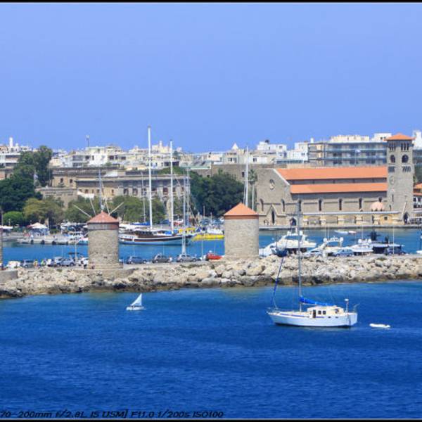 传说中,罗德岛是希腊神话中太阳神赫利俄斯Helios的领地,在港口的入口曾经耸立着赫利俄斯高举火炬指引人民的形象The Colossus of Rhodes。像高107英尺(约30米),是当时世界上最高的雕像,后被世人评为“世界七大奇观”之一。传说中雕像手举用作灯塔的火炬,两腿分开站在港口上。过往船只在其腿间穿行,非常壮观而有趣。雕像在公元前292年由该岛的建筑师Chares of Lindos负责兴建,并于前280年竣工,建设过程共13年。公元前226年,巨像不幸毁于一场地震中,此时距完工仅过了50多个年头。