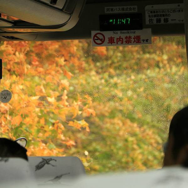 可惜,就是无法下车。。。。。车上的大玻璃各种脏,还有水。。。哎在12点45分时候,我们就到了阿寒湖了,在服务中心下车,导游说15点回来原地集合上车。
