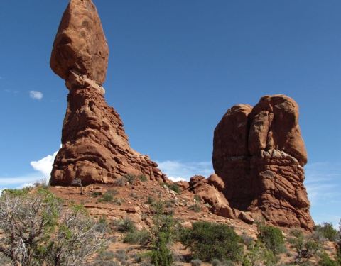 从公园景观大道回来的半程正好是平衡石(Balanced Rock)景点。伊甸园景点从公园景观大道回来的半程正好是平衡石(Balanced Rock)景点。平衡石就在公路旁边,这也是公园中为数不多的不用走路就能近距离欣赏的景点。在坡顶的一堆乱石当中,一根高达40米的石柱拔地而起,石柱细颈的上面不...从公园景观大道回来的半程正好是平衡石(Balanced Rock)景点。平衡石就在公路旁边,这也是公园中为数不多的不用走路就能近距离欣赏的景点。在坡顶的一堆乱石当中,一根高达40米的石柱拔地而起,石柱细颈的上面不可思议地顶着一块硕大的椭圆形巨石,看似摇摇欲坠,实则稳定平衡,所以把它叫做平衡石。可能因为离公路近观赏方便,在这里游览的人不少。有人说它像燃烧的火炬,有人又说像杂耍的海豹,还有人说它像含羞的少女。但我怎么看也说不出像什么,就是觉得它是那样的高贵优雅,婀娜多姿,真是难得一见的奇石景观。 展开