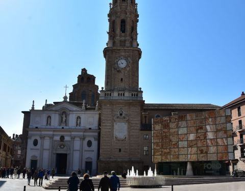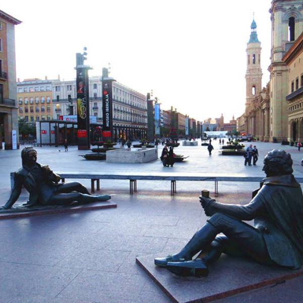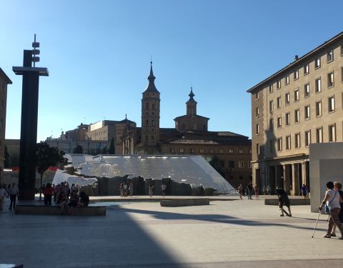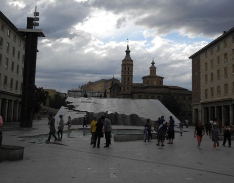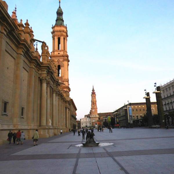 很大的一个广场,正中间是皮拉尔圣母教堂,旁边有许多五颜六色墙壁的建筑很大的一个广场,正中间是皮拉尔圣母教堂,旁边有许多五颜六色墙壁的建筑。广场上有几个小型雕塑,会喷水。西侧是一个大型水景,傍晚放水时仿佛瀑布潺潺。