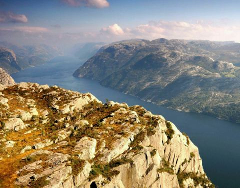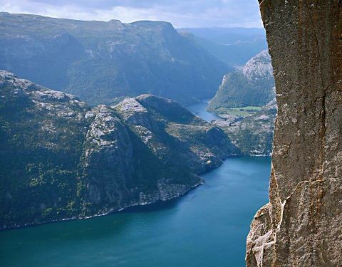布道石(Pulpit Rock)地处挪威南部,靠近斯塔万格市的吕瑟峡湾中部,是一块天然形成的巨石,突兀地直立于峡湾深处的崇山峻岭中,垂直落差600多米,顶部是一个平台,整块石头的线条像刀削一样平直,它是挪威的峡湾旅游标志。据悉被美国有线电视新闻网(CNN)旗下的旅游及生活网站CNNGO,评为全球50处最壮丽的自然景观的首位。