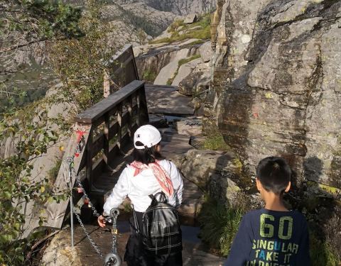 带小朋友来回走了4-5个小时,一路基本都是碎石子铺的路,建议带上登山杖带小朋友来回走了4-5个小时,一路基本都是碎石子铺的路,建议带上登山杖。坚持到最后景色确实很漂亮,可以看到峡湾,可以拍出网红照片