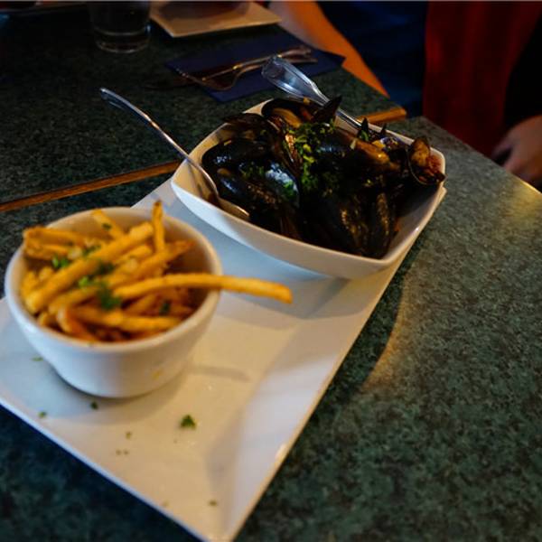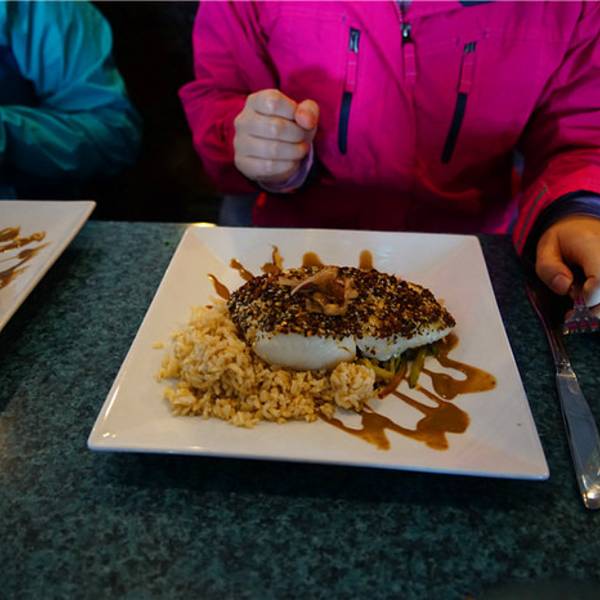 这个餐厅本身不要找错了地方,它并非在 seward downtown,而是在海港区。在海港区的公共停车场停下来,对面一眼就能看见CHINOOKS的大牌子。Chinook其实在这里是指三文鱼的一种,也就代表着本餐厅的特色—鱼!餐厅周围的风景非常的好,建议大家要求靠着海边坐的座位。他海边的座位靠着海港,可以看到,边上有渔民在同时鲨鱼,很好玩的。这个饭店还有坐在外面的座位,感觉海风习习,喝喝小酒非常惬意。它里面的装修风格是阿拉斯加典型的捕鱼风,你可以看到墙上有各种各样的三文鱼,螃蟹,你还可以看到各式各样的渔网捕鱼工具等等,所以当你进去,你就能感受到海风,海洋,广阔的感觉,到了你也不一定是坐在海边那一排,坐在里面就有种感受了。它的菜单很简单,就一张纸,里面把所有的菜都已经囊括了但是可惜没有图,只有根据想象来猜了。不过稍微有点贵,但量很大。藏酒还不错青口贝做的很不错,感觉十分新鲜,吃在嘴里十分鲜美,作为开胃菜,推荐点。主菜总结下来我个人认为,三文鱼量够大够足,烧得很嫩,表层调味料十分鲜美但是我并不知道它是什么,总的来说是外酥里嫩,入口即溶,旁边的配的饭也很好吃。Sablefish是这里最值得点的主菜,够嫩,够鲜。虽然量不如三文鱼大,但是比三文鱼更加细腻,配的芦笋,也很新鲜。Halibut稍显逊色,它的量是所有我们点的鱼中最大的,适合玩得特别累的同学,但是呢做法比较美式,就是油炸,如果你不是特别饿,肯定吃不完。