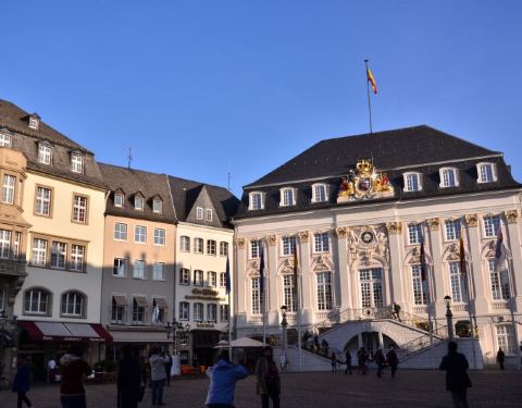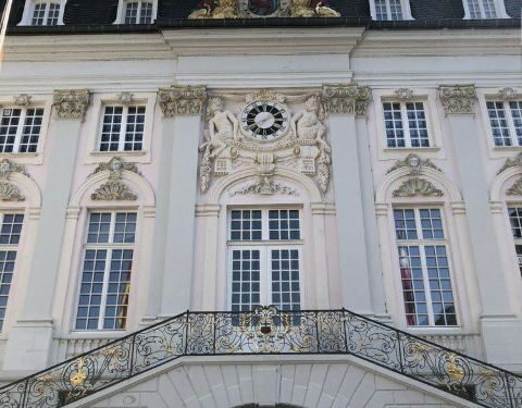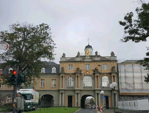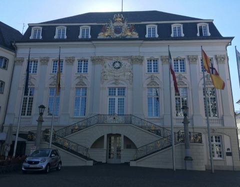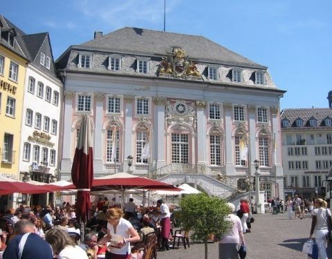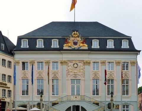波恩老市政厅是一栋很漂亮的老房子,门口的广场上停了很多颜色鲜艳的卡车,出售各种蔬菜,鲜花,水果和美食。它是一座巴洛克式的建筑,颜色白里透粉,墙面上有银色和金色的装饰,是不得不来的旅游必经之地。