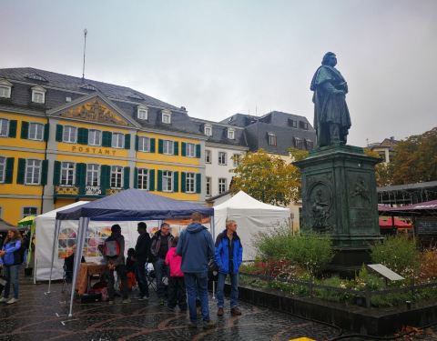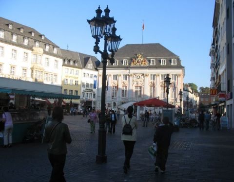 从火车站出口处一路前行,沿通往新城的步行街进发,能够依次到达游客中心,贝多芬广场,和明斯特大教堂。在周末的时候贝多芬广场里总是搭上白色的棚子,摆上跳蚤市场,可以从这里买到上好的有机水果和自家制作的奶酪,或者长得歪歪扭扭的萝卜和土豆。要是有兴趣,还可以花点儿时间淘一淘古旧的小物件,不过,讨价还价还是适可而止,不然会被摊主追打赶走的。