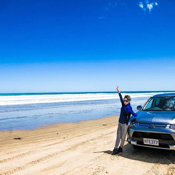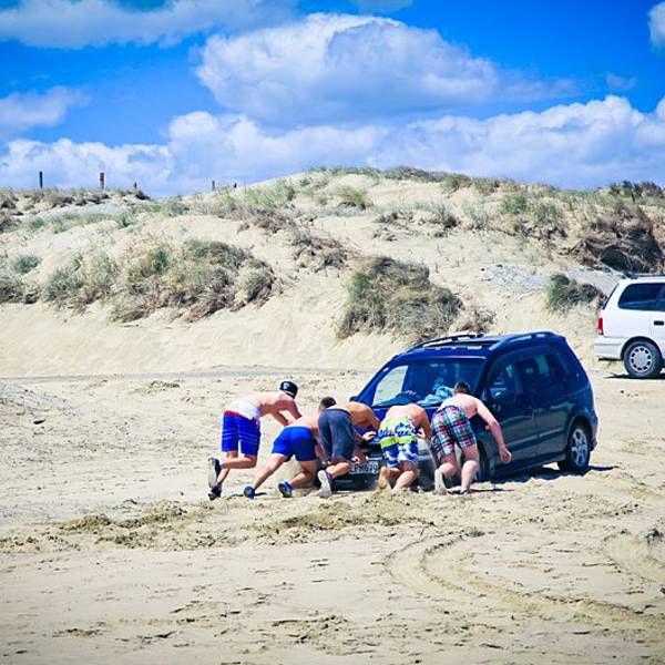 90里海滩 90 MILES BEACH (距PAIHIA镇200公里) 从PAIHIA出发,开到90里海滩将近200公里。但是车子冲下沙滩的那一霎那,你就会有不在地球的赶脚。。。。 90里海滩之所以出名,是因为海岸线呈一条笔直的直线,不信你可以看看新西兰的地图,最最左上角的海岸线是一条直线,那里就是90里海滩。所以站在海滩任意一处,向左右望去都是一望无际的荒凉,震撼! 90里海滩只允许四驱车驶入。一路上,有毛利汉子踏浪狂奔的激情片段,也有各国肌肉男奋力刨车的二货戏码。是——“男人不只一面”——的上佳观摩地。 所以我只是来插播汽车广告的,各位。 90里海滩有三个进口,我们是从第一个Waipapakauri Ramp进入海滩的。之所以只允许四驱车进去海滩,一个是怕近海水处陷车,另一个主要原因就是,每一个入口处的沙坑都很松软,进来容易出去难。 另外,如果选择来沙滩自驾,一定选择退潮期间,不然涨潮时,少处沙滩会被海水淹没,还是挺危险的。90里海滩风浪很大,沙滩平直,是冲浪的绝佳地点! 最爱这样的沙滩,没有一块碎石,连贝壳都难得一见。完全就像一块沙黄色的地毯,平整的铺在海滩之上。