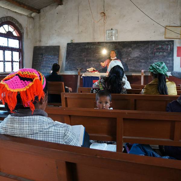老姆登村地处怒江峡谷,坐落于碧落雪山半山腰间的缓和坡地,居民分布大致呈梯形聚落,海拔1800米,地形为山区,这里是自驾游驱车抵达原怒江傈僳族自治州州府、碧江县县城知子罗的必经之地。怒族、白族杂居,怒族居多。全县9万余人口中,近7万多人信奉基督教,有基督教堂347座,基督教在这些高原乡村,已有100余年的历史。其中数老姆登村的教堂最为著名,它建在境内海拔2100米的山上,是一座中西结合的基督教堂。