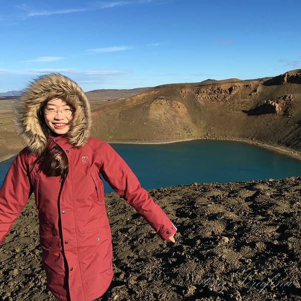 我们一路踉跄着上山,还好火山海拔不高,我们成功登上去了。一眼望去,真的以为登上了月球表面。Krafla山体呈硫黄色,也是光秃秃地裸露着山石。火山口凹下去有一个碧蓝的火山湖,蓝蓝绿绿的色彩不逊九寨。