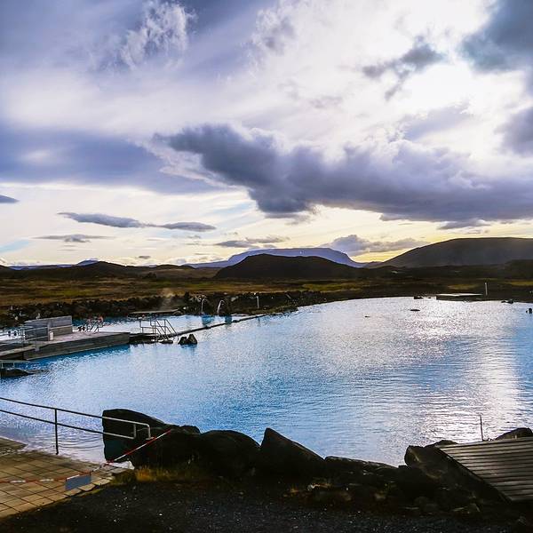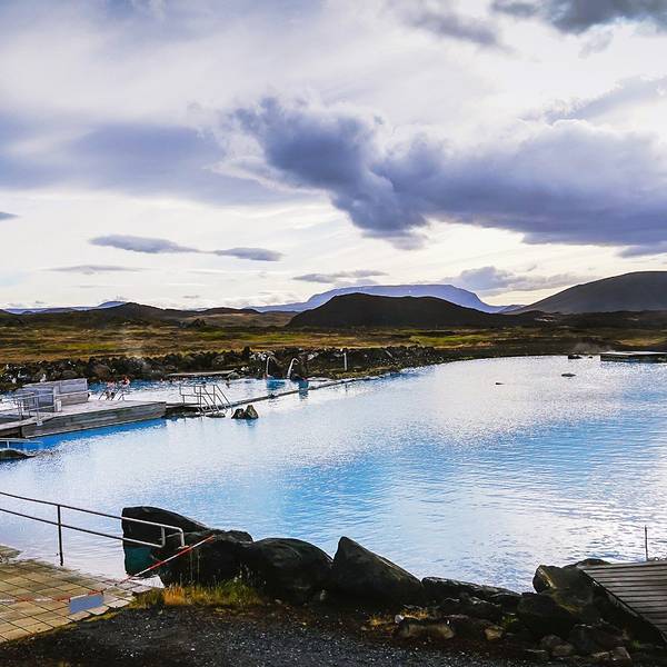 我和Heidi准备投入米湖温泉的怀...在波光粼粼的湖旁,还有一处根据地热区域开发的天然温泉:米湖天然浴池(Myvatn Nature Baths),蓝绿色的水面升起奶白色的热气,对于疲惫的旅行者来说,是一幅充满诱惑力的画面。