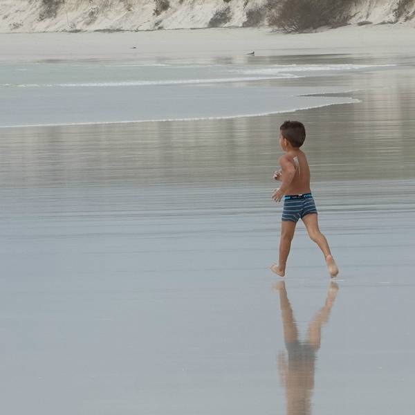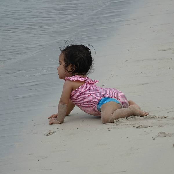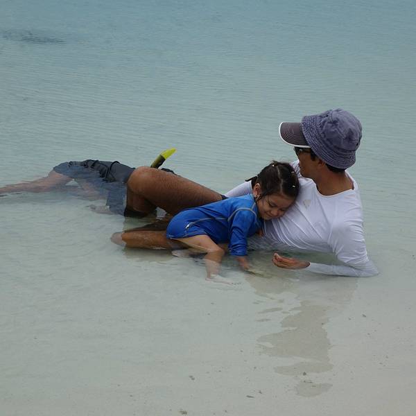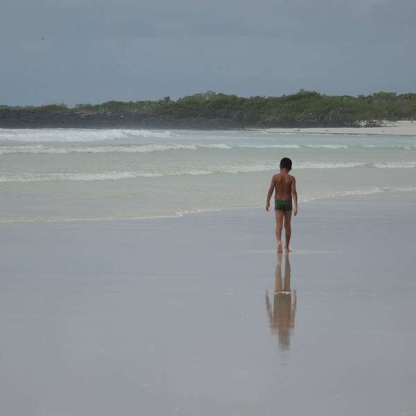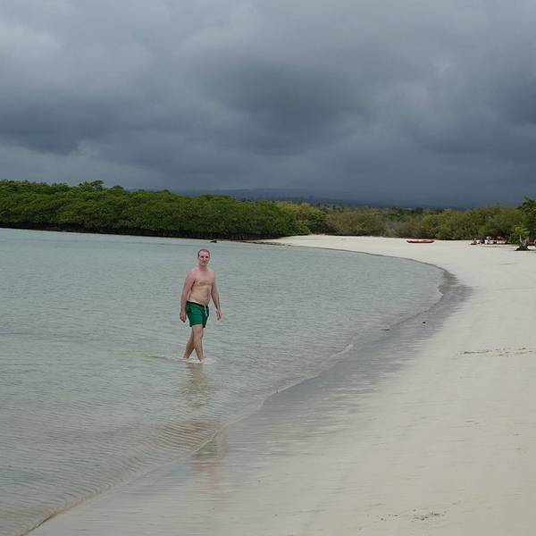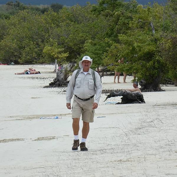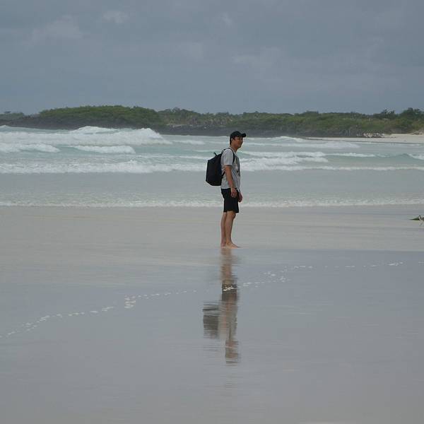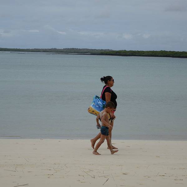 这是一片非常宽阔的沙滩。偏偏田儿特别热衷于这个游戏,乐此不彼的在海浪里钻来钻去。田儿依然在海浪里起伏下午的活动很简单,海滩游泳。主岛上有个著名的白沙滩,叫做海龟沙滩。整个加拉帕格斯群岛最长的白沙滩,从酒店出发,需要步行2.5公里。中间要穿过一片山林,石头铺的小路仅仅能并行两个人。小路上来来往往的人很...下午的活动很简单,海滩游泳。主岛上有个著名的白沙滩,叫做海龟沙滩。整个加拉帕格斯群岛最长的白沙滩,从酒店出发,需要步行2.5公里。中间要穿过一片山林,石头铺的小路仅仅能并行两个人。小路上来来往往的人很多。山林中天气闷热,似快要下雨一样,一个小时的路途也走的非常疲惫。每次爬上一个小山头以为面前就是大海了,却又一次看到长长细细的小路望不到尽头。终于,越靠近海,小路上白色的细沙越多。当小路被白沙覆盖的时候,白沙滩终于到了。这是一片非常宽阔的沙滩。沙子细白无杂质。海水非常的清澈,淡绿色的水夹着纯白的沙子软软的扫过脚面,一扫一路上的疲劳。唯一可惜的是天气,天阴,云层很厚,没有一点阳光,没有阳光陪衬的沙滩就像缺了点什么,颜色也不是那么的漂亮。我们只能想象这片纯白色的沙滩和碧绿的海水在阳光的照耀下该有多美。听说往西走二十多分钟,还能看到小的锤头鲨和海龟。