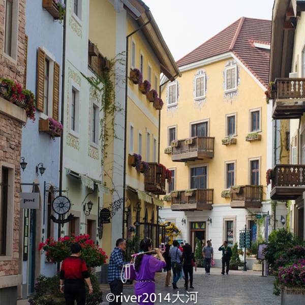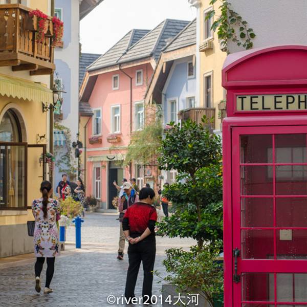 从小区门口可以步行或者乘坐电瓶车到小镇的入口处,进入小镇必须经过一座桥,首先看到的就是小镇的钟楼,高耸,尖顶,比别的建筑都要高。小镇的面积并不大,只有五六条街,整个小镇的风格是完全的欧式化的,从房子,街道,店铺以及装饰来看,都很有情调。在路边有红色的电话亭,有书店,当然还有几家不错的西餐厅,这里吃饭也不成问题。小镇上有保安流动巡逻,主要是看游客有没有从事商业拍摄的,这里拍摄婚纱照片有专门的摄影店负责,不过旅游照片就随便拍了。