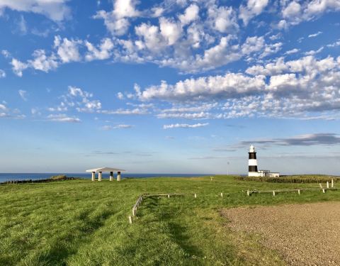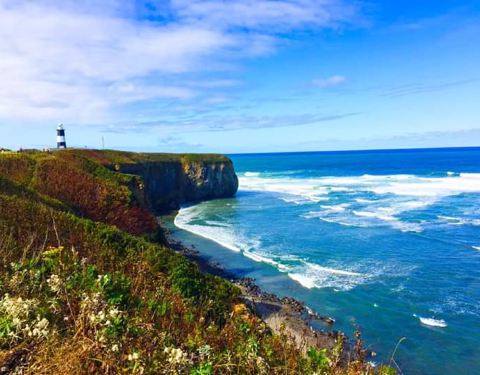 能取岬有一个背靠大海的美丽牧场,夏季会有牛羊在此放牧,还有蔚蓝的大海和黑白相间的灯塔能取岬有一个背靠大海的美丽牧场,夏季会有牛羊在此放牧,还有蔚蓝的大海和黑白相间的灯塔。这里还是最适合无人机航拍的地方,高空的视角非常壮观。
