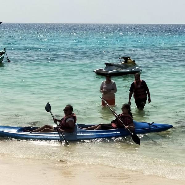 金骆驼 但是这里很奇怪,在餐厅点的海鲜里,居然没有,难怪这里的螃蟹生活得那么悠闲。前海,还会有很多水上活动边找潜店,还要边在海边晃荡,这就是比基尼沙滩前面的海,大部分时候都有浪,所以朦朦胧胧的。只有在这一块,可以穿泳衣游泳,可以躺在沙滩上晒太阳。沿着巷子穿到后面的沙滩, 除了晚上海风轻吹,大部分时候海水...边找潜店,还要边在海边晃荡,这就是比基尼沙滩前面的海,大部分时候都有浪,所以朦朦胧胧的。只有在这一块,可以穿泳衣游泳,可以躺在沙滩上晒太阳。沿着巷子穿到后面的沙滩, 除了晚上海风轻吹,大部分时候海水就这么静静的,清澈见底。没有珊瑚,也很少有大鱼造访。但岛上居民给我们说,有时候这里会有鲨鱼,那肯定是小礁鲨咯。前面的海一般都是游客,后面的海一般都是当地居民,不过好像居民也怕晒黑, 都会在太阳下山后来海边走走,游游泳。前海,还会有很多水上活动。我倒是很喜欢这些活动咨询台,花得花花扭扭的。吃完晚餐,就到海边去等待日落。其实大部分时候,我们更喜欢偶遇,但正好吃饭的时候看到太阳开始落下,好想看看太阳降下海平面的那一刻。傍晚的这个时候,石头上爬满了螃蟹,要是在国内,恐怕我们就要约上小伙伴们,开始抓螃蟹了吧。但是这里很奇怪,在餐厅点的海鲜里,居然没有,难怪这里的螃蟹生活得那么悠闲。