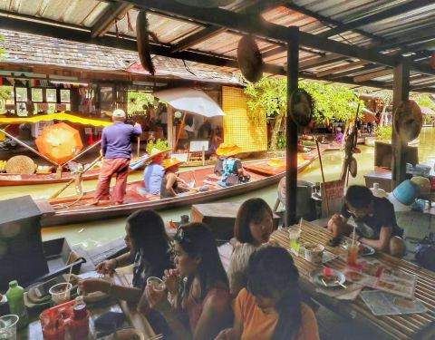 大城一日游的中午休息的地方,人不算多,没去过曼谷的水上市场,来这里体验下也不错大城一日游的中午休息的地方,人不算多,没去过曼谷的水上市场,来这里体验下也不错。这里会坐船带你游览一圈,10几分钟,岸上有很多服装店,食品店。市场内还有一个表演厅,好像是花钱看表演,散场后,演员继续...大城一日游的中午休息的地方,人不算多,没去过曼谷的水上市场,来这里体验下也不错。这里会坐船带你游览一圈,10几分钟,岸上有很多服装店,食品店。市场内还有一个表演厅,好像是花钱看表演,散场后,演员继续穿着戏服在市场穿梭。中午在这里休息,吃的东西性价比还不错。另外听导游说,这里水域的鱼是不能吃的,离寺庙近,当地人会把鱼在这里放生,难怪市场里面的小河,很多鱼又大又肥,各种翻腾,是有灵性的地方。 展开