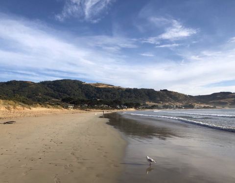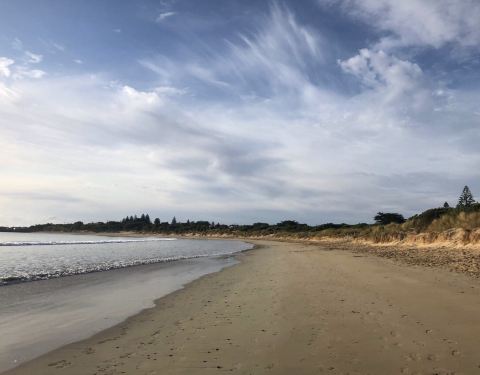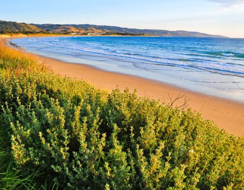 海岸线呈弯月形,被山和陆地拥抱着,被很安全的保护着。沙滩上很多冲上来的海植物:类似海带之类的早上的Apollo bay,安宁、清静。太阳照在海面上,海浪不停地拍打沙滩。沙细腻柔软,沁着凉意。沙滩上很多冲上来的海植物:类似海带之类的。海岸线呈弯月形,被山和陆地拥抱着,被很安全的保护着。