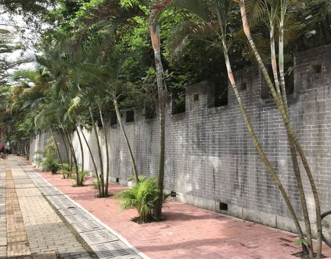 从洪圣古庙出来,沿着青灰色的砖墙和路旁的椰子树前行,白兔岗炮台就到了