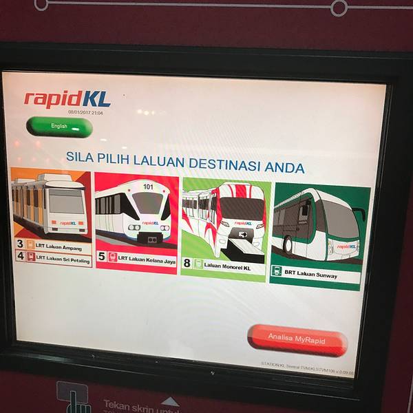 地铁站其实都不大,除了KL Sentral (中央车站)和 Puduraya (富都车站)之外,其他都是小站台,所以搭乘起来很方便!附上地图大家有空可以简单研究一下,英文不好没关系,直接看谷歌地图上面来对应找你要去的景...地铁站其实都不大,除了KL Sentral (中央车站)和 Puduraya (富都车站)之外,其他都是小站台,所以搭乘起来很方便!附上地图大家有空可以简单研究一下,英文不好没关系,直接看谷歌地图上面来对应找你要去的景点位置就OK啦!提前准备好零钱(纸币和硬币都可以投掷)这是吉隆坡的四种形式的列车!具体选哪一种,就根据你的谷歌地图上面显示的来选择,因为每个景点之间到达站的乘坐班次都有所不同,所以这里要看清楚!选择完列车形式之后,就是看你所选择的站台,然后就会有相应的金额出来,其实跟国内的地铁买票方式都差不多!最后出站的时候自然要归还这个卡!