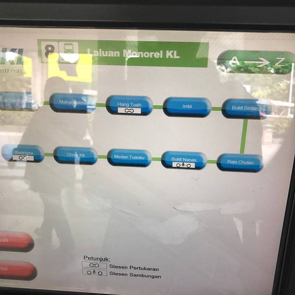 每到一个城市,我发现我都能彻底的变成当地人,就算买20个人的票也是那么的轻车熟路。轻轨站这边风景独好!只需一站路就可以到达吉隆坡中环车站KL sentral,KL Sentral是很重要的一站。有多条线路都在KL Sentral这一站交汇:Putra轻轨线、KLLA Express、Klia Transit、KTM火车。可选择在KL sentral转搭其它的交通路线。