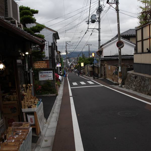 走在这通往清水寺的石板道上, 感觉还真是不一样。 石板道非常干净, 没有那种杂草丛生的感觉, 而是非常清新的感受。 石板路旁尽是些店家, 都有着当地特色。 店家一多, 就需要各有特色, 才能赢得客户青睐。 确实每家店看似卖的工艺品雷同, 其实都各有其特色。 石板道曲折绵延, 拾级而上看层层叠叠的店家。 商店都是平房, 不算低矮, 不过因为有坡度, 自上而下俯视就能看到层层叠叠的影像, 非常有意思的。 而且店家都各在门前挂着灯笼, 朦朦胧胧的亮光, 映衬得整幅画面更为有趣。 走在石板路上望着过往的三三两两游客, 感觉虽然人不多, 但是这更适合富有古典韵味的石板路。 逛逛感觉很有意义的, 看人们也都只是背着轻便的小包, 轻装出行。 去的时间已经不早了, 一些店家已经关门, 但是看着门口的装饰, 以及一些店家透明玻璃橱窗, 觉得还是非常有特点的。 拾级而上的石板道直通清水寺, 夹在道中抬头而望, 清水寺就在路中央的顶层, 感觉这个设计构图也很完美。 清水寺的历史很悠久, 这条石板道自古以来不知有多少人踏过, 但是一点都不显得破旧, 相反有一种充满活力的感觉。 石板路沉积着一代代路人的旅程, 又反馈着其自身的凝重。 还是很喜欢走这条道路的! 宽敞整洁, 很有意义。