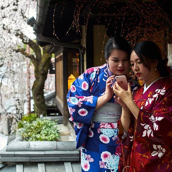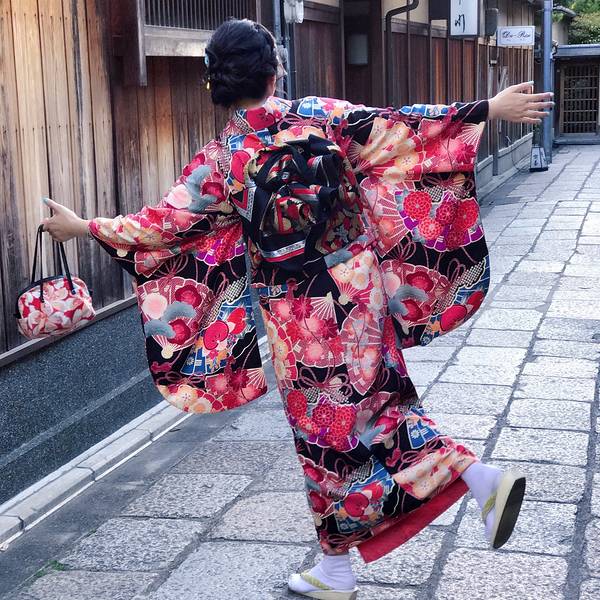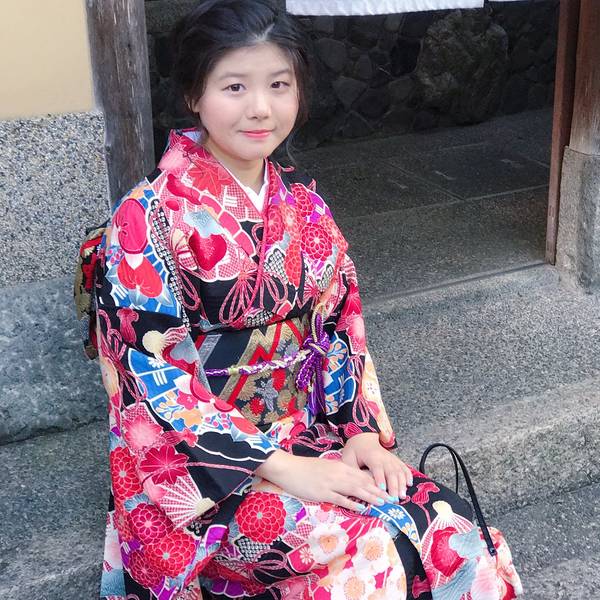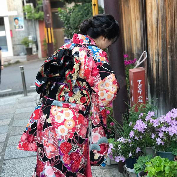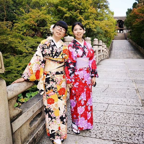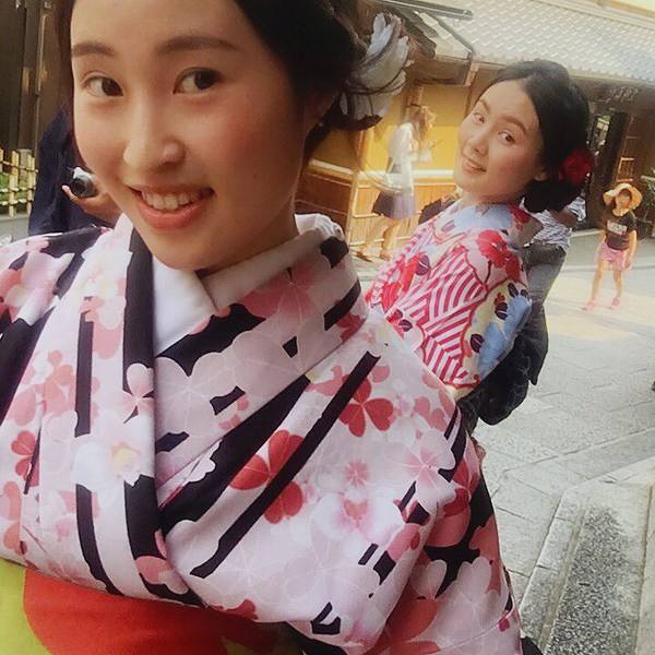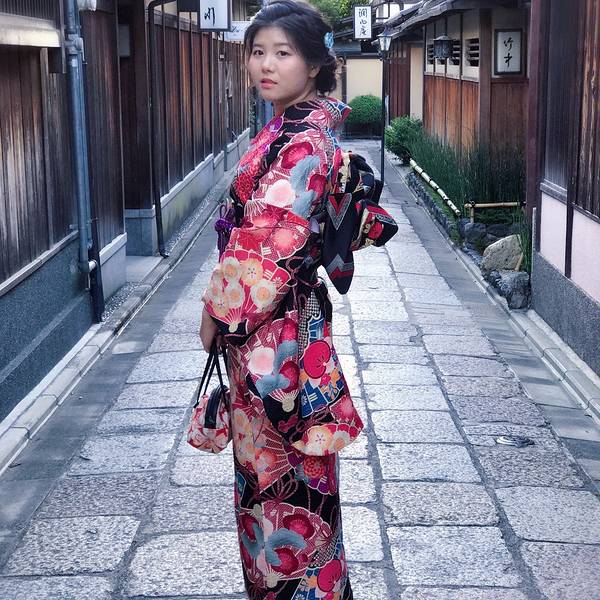 清水寺门口那个超级大长坡有很多小店,各种特色食品、工艺品……总之就是景点常见的那种。京都超热的抹茶系列,街上还有很多抹茶冰淇淋什么的,我还蛮喜欢这个味道。附近小路里偶遇中学生下去之后我便去换了和服,另外两个同伴对这个没兴趣所以是我一个人穿……我去的是First的清水寺本店,下午三点多还有一些好看的二尺和服。在淘宝订的衣服、发型和化妆,因为配色的关系去现场又加钱换了宽腰带和绳结,以及跨店归还的服务,最后整个下来500多人民币吧。 一般店铺都有的和服款式是:一个特别简单基础的日常款、小纹、二尺、振袖。价格依次增加,选喜欢的就好。发型还是建议做一下除非你自己会盘,不然有点奇怪。化妆其实不需要,他们也就是个日系裸妆,主要是我自己不会化。 接下来我们是顺着二年坂往八坂神社走,沿路都是那个日式的房子和小巷,特别棒!和服也非常精致,感谢小伙伴给我拍照,iPhone7P,像素就是遛!