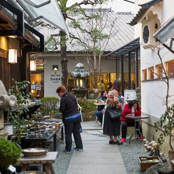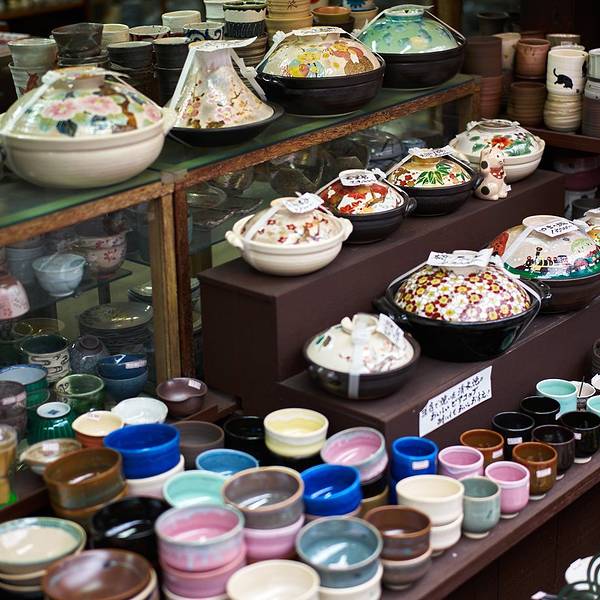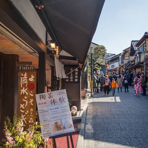 前往清水寺的途中,有几条像二年坂、三年坂这样古色古香的小街道,周边特色店铺林立,陶器店、甜点店、餐厅、茶楼、饰品店等等都分布其中。在此可以选购各种京都特产,著名的清水烧瓷器就在这里。