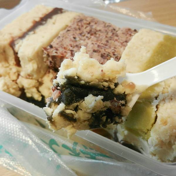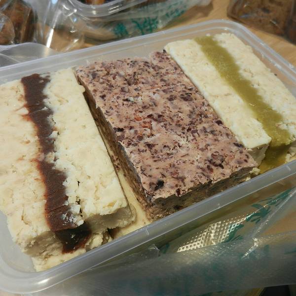 伊宝荷叶甑糕隔壁就是白记年糕,作为牛街的老字号,人气显然要更旺一些,但也只排了3分钟就轮到了。这家更为人知晓的店其实是分店,总店位于超市十字路口往东50米的输入胡同,经过的时候太早还没开门,所以还是来这里购买。假如这里太拥挤,也可以去那边,品质一样的。各种小吃种类很多,江米年糕、紫米年糕、黄米年糕、年糕坨、盆糕、山楂糕、芝麻卷糕、椰蓉卷糕,还有糖耳朵、豌豆黄、排叉、炸糕、糖火烧等等。多数人推荐的无非是年糕、豌豆黄和驴打滚。驴打滚13.8元/斤,切了一条的1/4尝尝。因为豆沙多,所以切面并不是好看的那种螺旋,糯米绵软柔和又充满韧劲,外层裹着的黄豆粉略显单薄,整体吃起来并不黏糊噎人。只是豆沙的甜度我觉得轻微偏高。江米年糕13.8元/斤,年糕和我们这里意义上的年糕不一样,是有颗粒感的糯米,三层白糯米中间夹两层厚厚的豆沙,再上面是现切的山楂糕。空口吃糯米和豆沙没两口就腻了,幸好有配搭的山楂糕,这种俏皮出挑的酸度非常非常解腻,否则可能会吃不完。这家的甜度和 无锡 的穆桂英相当,所以我个人觉得偏甜一些,不算讨我喜欢。产品的保质期很短,同样需要当天吃完。一天肚子里塞太多糯米制品会有负担,建议少称点试试。