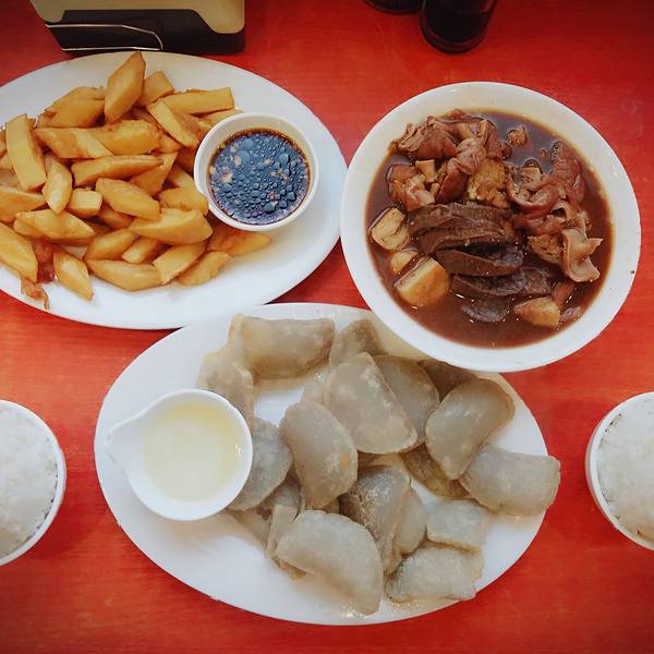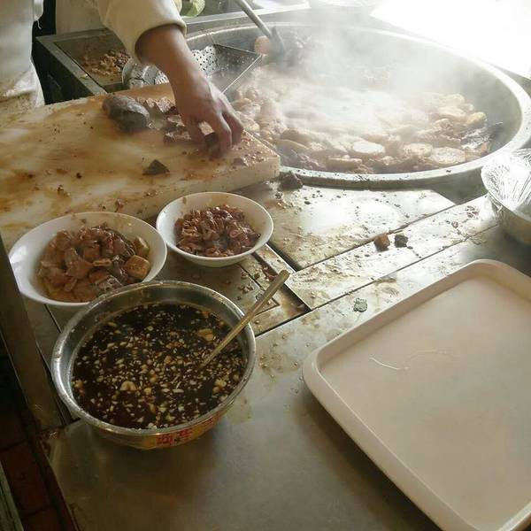 牛街不似簋街一样是整整一条街集中一家挨一家的美食,而是围绕着牛街,周围很大一片地方的大街小巷里面分散隐藏着很多的美食店,这里的美食店虽然不见得装修多么的精致华丽,但是有很多都是老店,也就是俗称的苍蝇小馆,破旧的牌匾、窄小的门面下隐藏着的是刺激味蕾的美味。牛街上的餐馆以清真为主,在附近搜索大众点评附近的美食,排名前几位的都是网上评价极高的店铺,路过了一家排名卖清真熟食的窗口,队伍从楼前一直排到了马路边,长长的两列队伍,颇为壮观。今天我和小伙伴选择的是正宗的北京卤煮店,北京小肠陈饭庄,打算品尝一下北京地方特色美食。在走向这家店的路上,也见到了不少其他的店面,但是我们目标坚定的没有停下脚步。其实我和小伙伴到达的时候已经过了最繁忙的饭口时间了,大概是一点多钟,但是一开门的场景还是有一点点吓到了我们,屋内竟然依旧是人满为患,连空位子也没有,点餐的窗口也是排了长长的队伍,看到这样的场景,我们就知道,这算是来对了地方,于是两人分工,一人等位,一人点单,餐馆的效率很高,大概15分钟,我们就吃上了饭。两个人,两碗米饭,一份炸咯吱,一份炸灌肠,一份大份的卤煮。炸咯吱个人感觉一般,没有溜咯吱好吃,但是炸灌肠就是很赞了,卤煮更是滋味浓厚,我这个之前不吃内脏的人也吃了好多,味道十分正宗,强烈推荐。