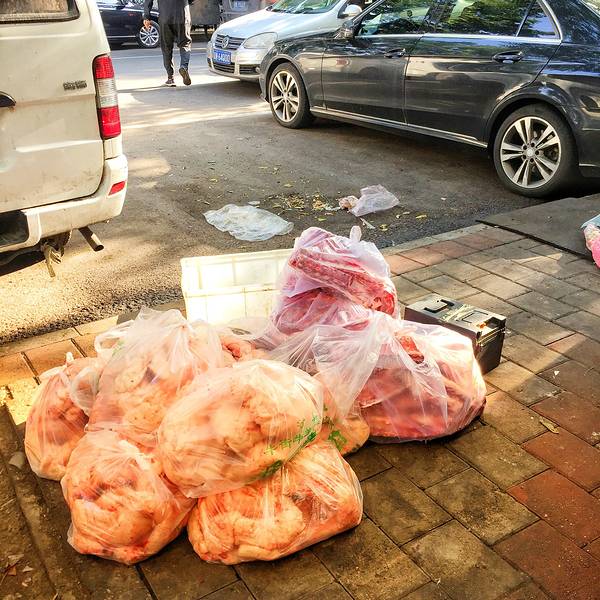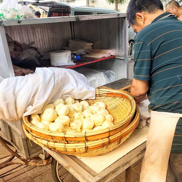 教子胡同与输入胡同的交叉路口,偶遇一位老大爷的包子摊,6:25,排着五六个人,每个人都10个20个地买包子。包子只有一种牛肉大葱馅儿,堆在筐里,简易的三轮车,边上还有一张桌子,放着醋和辣椒油,买的人看着像是附近居民,有人直接在一旁现买现吃,一口包子蘸着辣椒油,垂涎欲滴。看这阵仗我们便也跟着排,身上只有两个钢镚儿,刚够买1个。
