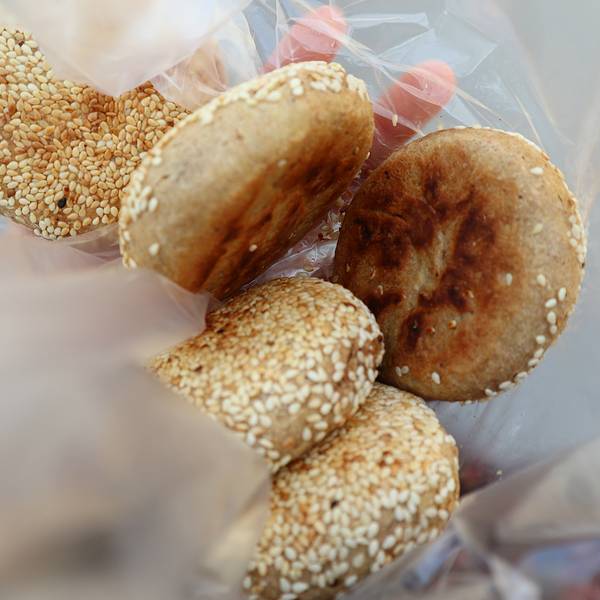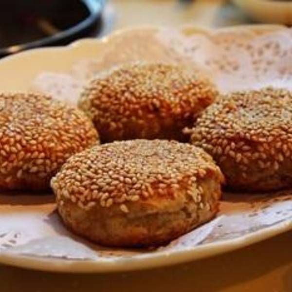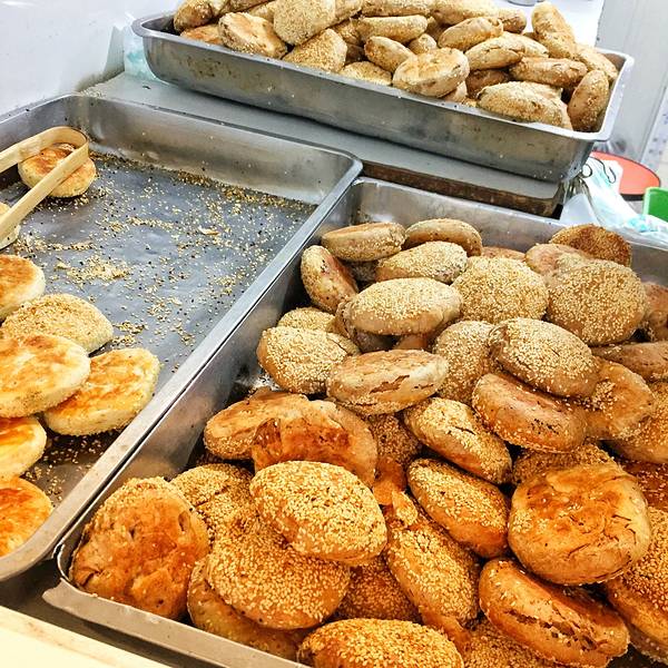 输入胡同的店都挺小,稍不留神就容易错过,小店一家挨着一家。这家在牛街清真牛羊肉市场旁,一眼瞅见似乎是烧饼专门店,就挺乐意去试试的,毕竟只做烧饼,大概不会不好吃。烧饼就两个口味,椒盐和麻酱,都是1元1个,买5赠1。正在琢磨要买几个,来了两个人,一人提了100个走了,是的你没看错,100个。麻酱烧饼可能更受当地人喜欢,反正来买的以这个口味居多。我两款都试了试。