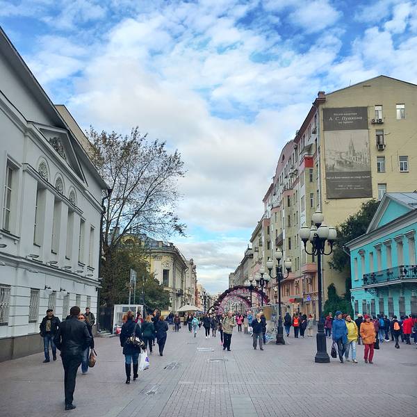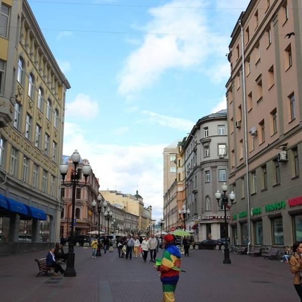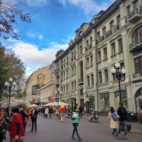 阿尔巴特大街是莫斯科市中心最有名的步行街,现在的阿尔巴特分为老阿尔巴特大街和新阿尔巴特大街,而老阿尔巴特大街从15 世纪就已经存在了。新阿尔巴特是一条现代商业街,有很多百货商场。老阿尔巴特大街依然保留了民俗风情,但两侧却布满了纪念品摊位和商店、餐馆、咖啡馆和酒吧,这里俨然成为了又一个为旅游者打造的步行街,只有街道上经常出现的街头艺人值得驻足。