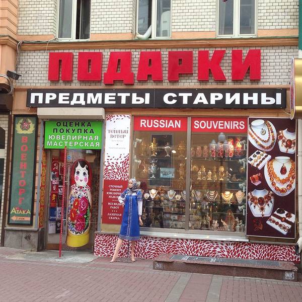 新阿尔巴特街主要是旅游街了,店铺大多是古玩店、旧书店和珠宝店。小店铺一家挨一家,商品种类极其繁多,如暖和的护耳皮帽,精心编制的大草鞋,琳琅满目的耳环、坠子,各种古怪的护身符等等。