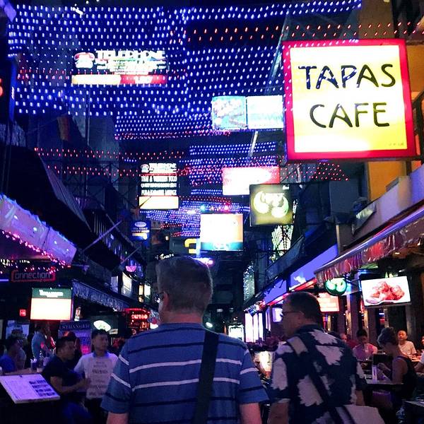 晚上暹罗广场随便找了家餐厅吃了晚餐,结果是踩雷,一个晚上收获最大的是路边的芒果奶昔,不要太好喝!!!超浓郁乱入的酒吧一条街我们停留在 曼谷 的时间并不多,而水上市场在我心里是一个来 泰国 必须要去的地方。 曼谷 附近这里有几个比较有名的水上市场,但是基本都是在周末开,只有丹嫩沙多是全日开放的,所以第二天我们选择报一个半日游的团去丹嫩沙多水上市场(价格是一百二十多一个人,体验非常好)