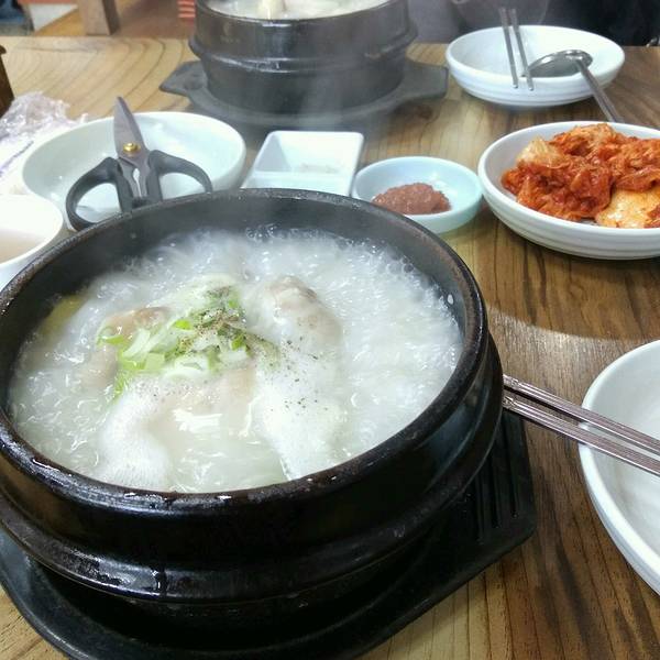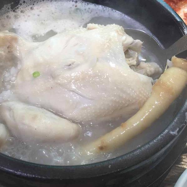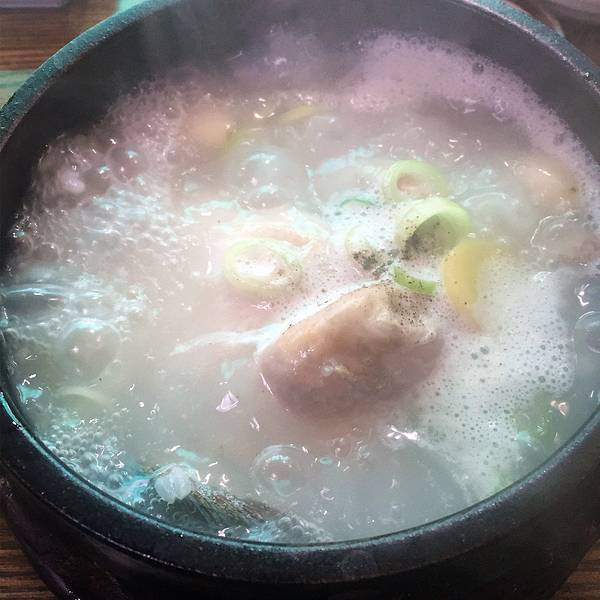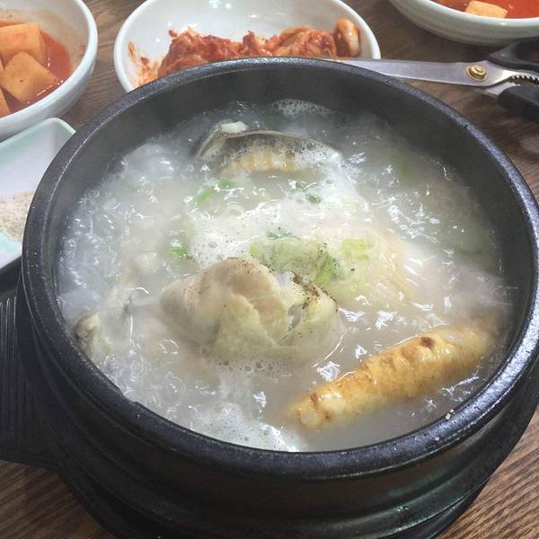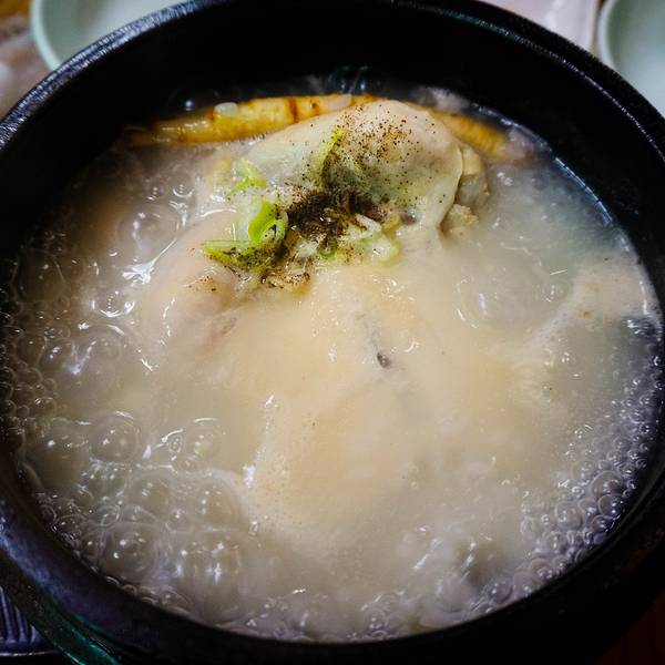 一份参鸡汤12000won,鲍鱼参鸡汤17000won,里面有两个鲍鱼。鸡肚子里塞满了糯米所以显得汤很白,鸡炖的很烂,一个人一份足够吃饱。我们点的鲍鱼参鸡汤。刚端上来的鸡汤,还在沸腾着。基本上每家餐厅都会免费提供自己泡的泡菜,超市里卖的袋装泡菜都没饭店里的好吃。