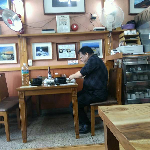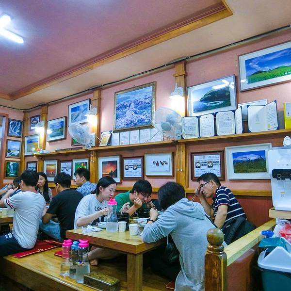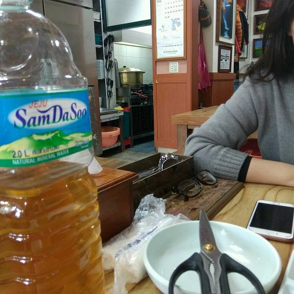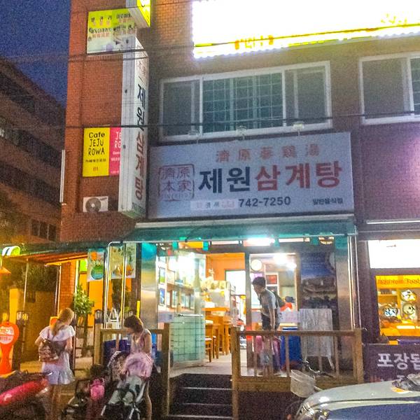 我坐的这个吉祥航空的航班几乎每次都晚点,还好今天只晚了20分钟,抵达济州机场大约10点半。机场3楼的7-11有卖T-money卡,选了个line的公交卡,卡费4600won,然后又充了30000won。 从机场打车到新济5000won不到,大约15分钟。济州的的士司机多为五六十岁的大叔,除了问候语基本不会中英文,但他们都很友好。虽然语言不通,可他们会用谷歌翻译你一句我一句的和我们聊天。在西归浦时,有个大叔甚至打电话给专门为中国人旅游服务的中韩翻译,问我们当天有什么旅游计划,需不需要在景点门口等我们把我们送到其他地方。 酒店下午两点才能办理入住,行李寄存到前台后就直奔附近的济源参鸡汤。中午店里都坐满了,只能在外面排队,还好我们到的还不算迟,只等了一桌,我们进去后外面就开始排满了长队。店里大多是日本游客,而对面的偶来面条则是韩国人更多。 一份参鸡汤12000won,鲍鱼参鸡汤17000won,里面有两个鲍鱼。鸡肚子里塞满了糯米所以显得汤很白,鸡炖的很烂,一个人一份足够吃饱。我们点的鲍鱼参鸡汤。刚端上来的鸡汤,还在沸腾着。基本上每家餐厅都会免费提供自己泡的泡菜,超市里卖的袋装泡菜都没饭店里的好吃。