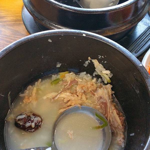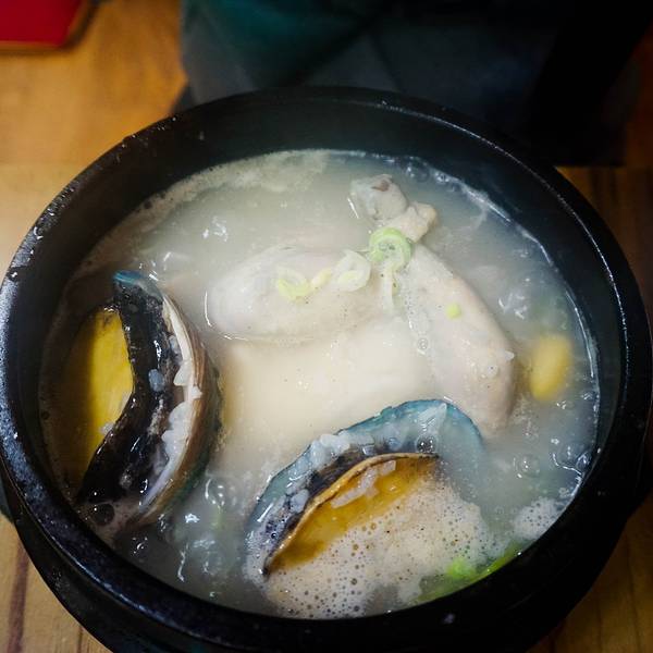 参鸡汤12000韩币一份,要是鲍鱼参鸡汤则是一份16000韩币,鲍鱼只有两个。 与其说是参鸡汤,我个人觉得更像参鸡粥,鸡个头不算特别大,肚子里塞有糯米和一颗红枣,碗里除了鸡和参,还有一些米粥,所以个人觉得叫参鸡粥会比较适合。 参鸡汤的鸡肉质嫩,入口即化,鸡肚里的糯米也是非常的软糯香甜。除了一锅参鸡汤,还会附上一些小菜,一人吃一份参鸡汤是很足够了,而且还会有些撑。