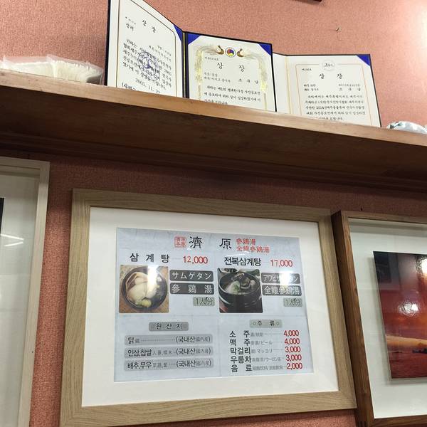 - 说老实话,觉得没有首尔的参鸡汤好吃,但是能吃到一份饱餐,我很满足了。墙上有好多证书,价目表清楚