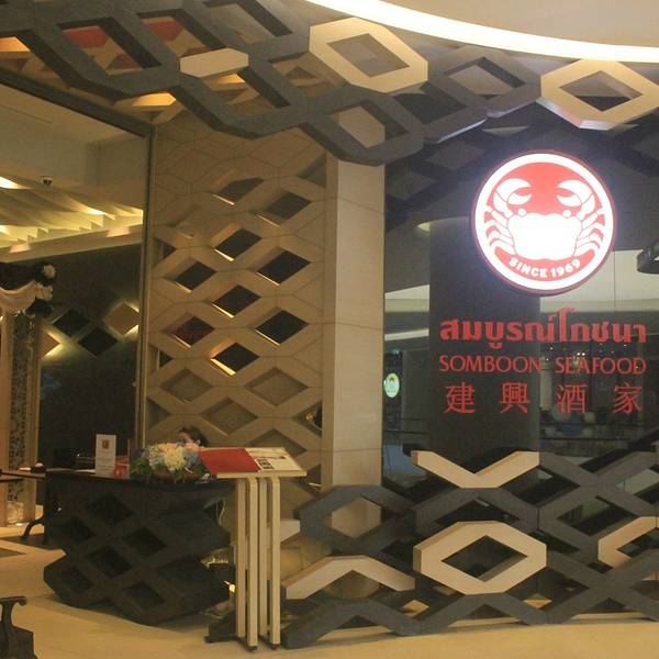 Somboon这个被多家媒体、旅游指南一再推荐的海鲜品牌近年来在曼谷开设了多家分店,Somboon seafood central embassy便是其中新近开业的一家。这家店一改Somboon以往海鲜排档的经营方式,直接入驻central embassy高端商场,装修上也颇为精致,如果没有事先了解的话,很难想象到这是以大排档起家的Somboon。Somboon seafood central embassy的交通极其便利,乘坐BTS在Phloen chit下车直接走天桥到central embassy,五层就可以找到Somboon。 营业时间:11:00--22:00 Somboon的服务还不错,进店后会有专人领位。 菜单有中、英、泰文介绍,图文并茂。所以点餐相对来说特别容易,此次点了招牌的咖喱蟹,还有葛抛叶炸石斑鱼。 咖喱蟹的咖喱与鸡蛋一起炒,咖喱的味道不是很浓,很适合国人的口味,蟹很肥,特别是蟹夹的肉质很细嫩。葛抛叶炸石斑鱼不推荐,鱼炸得有点硬,品尝不出鱼肉本身的鲜味,肉质比较疲软,鱼刺与鱼肉间不好分离,葛抛叶炸得很脆,有点像海苔的感觉。这家建兴算是连锁中的高端装修,如果想体验大排档的建兴,可以去其他门店。