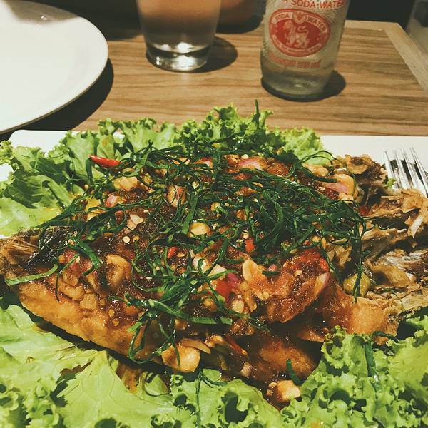 下午走去 Central Embassy 找大名鼎鼎的建兴酒家(距离酒店最近的一家,人少不排队)来吃曼谷第一顿饭,这个商场也是挺好逛的,人少、比较高级、空调足,门口还提供叫车服务,成了我们之后行程的中转站。 建兴最有名的是咖喱蟹,我们旁边的桌都慕名而来连吃好几天。无奈长安君吃螃蟹过敏(那为什么要来吃建兴酒家!掀桌),于是我们点了炒含羞草、芒果饭、泰式茶叶炸鱼、洪门猪排、两瓶苏打水(眼大肚子小差点撑死),加上10%服务费人均120rmb。 整顿饭没有失望的感觉,吃芒果饭更是吃出了恋爱的味道(啥)。泰式茶叶炸鱼,酸甜口微辣,鱼肉非常新鲜,也是充斥着香料的味道。炒含羞草。有香料的味道,口感和空心菜差不多。好吃~芒果饭甜甜甜甜,分量也大。