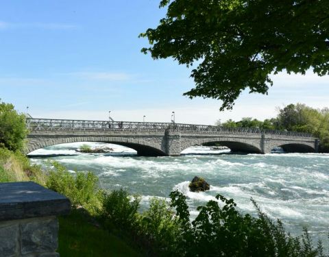 在尼亚加拉瀑布美国一端沿河岸向上游走不远,有一座桥樑,通过桥可进入尼亚加拉河中小岛,岛上树木成...