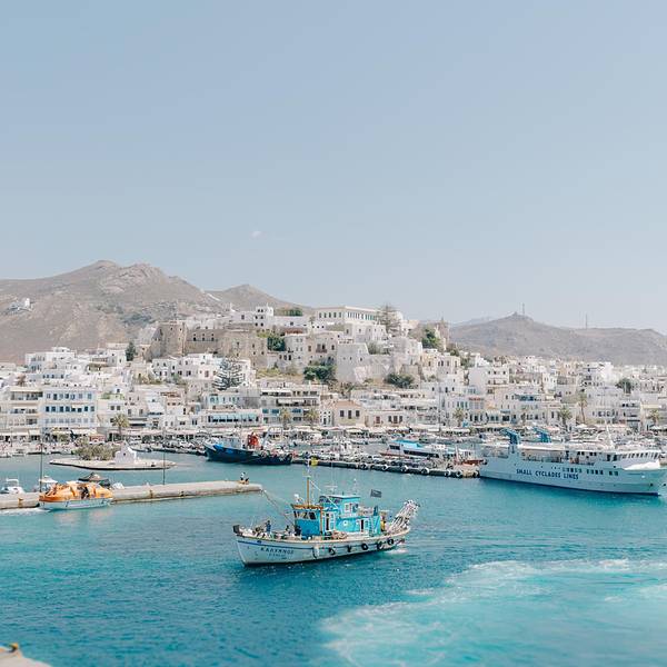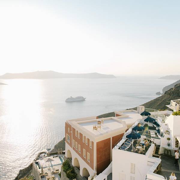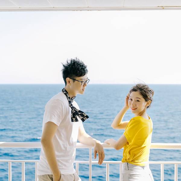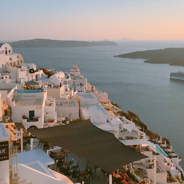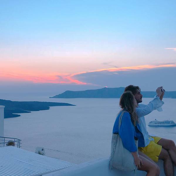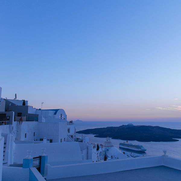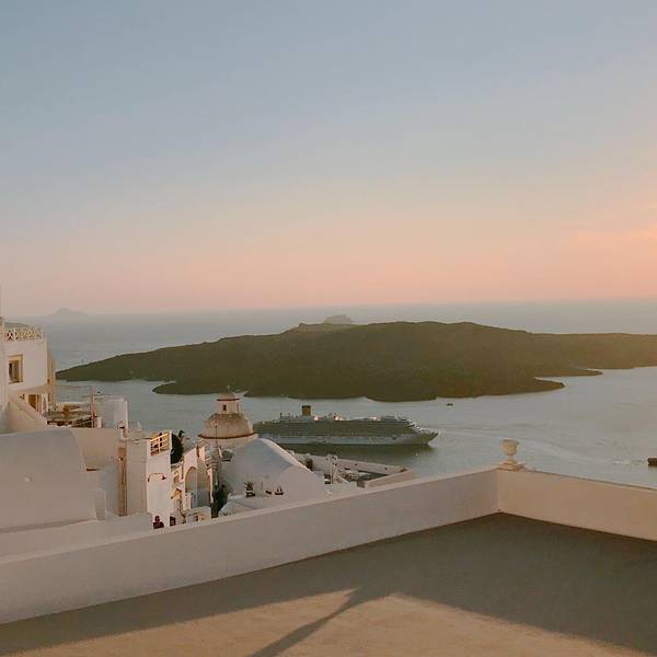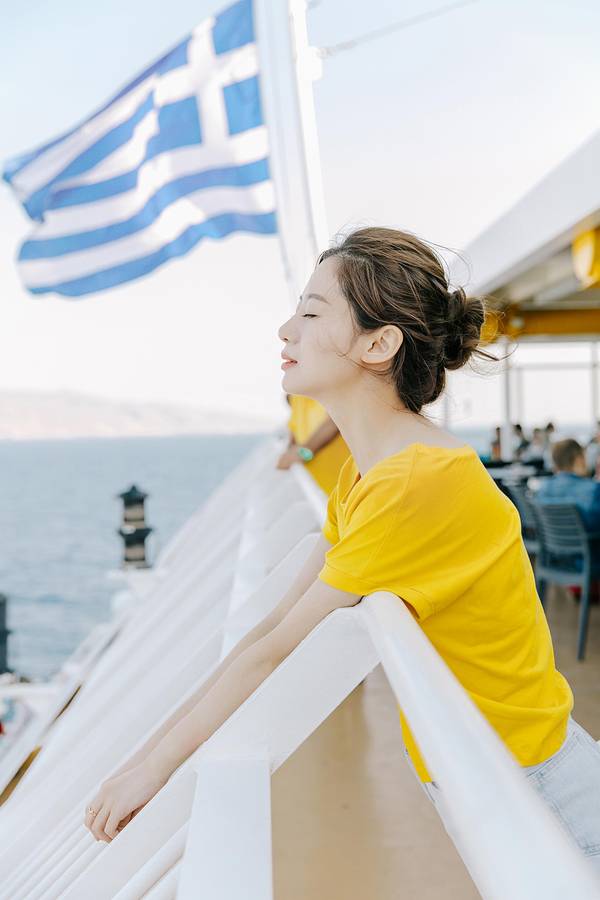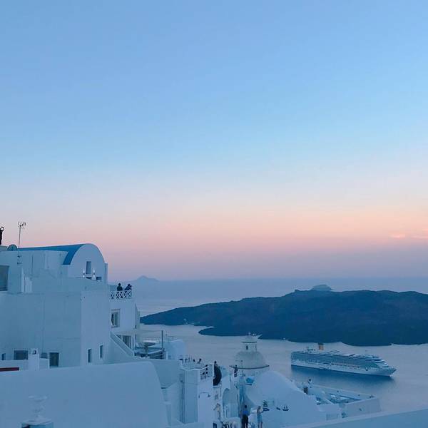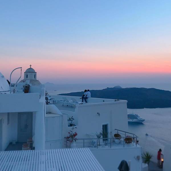 跟着谷歌地图走到了码头,很近,也就十几分钟的样子,而且沿路都是往那个方向过来的游客,大家都是去坐第一班去往圣托里尼的邮轮。上了邮轮之后天开始慢慢亮起来了,就是这张蓝色和粉色,肉眼看到的颜色更美,在希腊看的第一个日出。天刚刚亮就发船了,好像说一天去圣岛的邮轮就两趟,毕竟一次要七个小时,我们赶最早的一班,到岛上都要下午3点多了。希腊的可口可乐和希腊的国旗,以及中国人的手👋中间路过了两个岛,停了两次,不是很大,但也都是纯白色的房子,感觉这边好像所有岛都是那种风格,而圣托里尼岛就是名气最大的那个了吧,面积是不是最大就不清楚了。在船上开始我们的第一组拍摄,穿的便装,先拍一些生活风的游客照吧。在爱琴海上漂了七个小时之后我们终于到达了目的地——圣托里尼岛,真是太不容易了,飞了十几个半小时又漂了七个小时,邮轮远远看到圣岛的时候,大家全部都站了起来,涌到栏杆边上看,我们也在指着看哪个是费拉,哪个是伊亚,整个岛的规模确实要比之前路过的两个大很多很多。